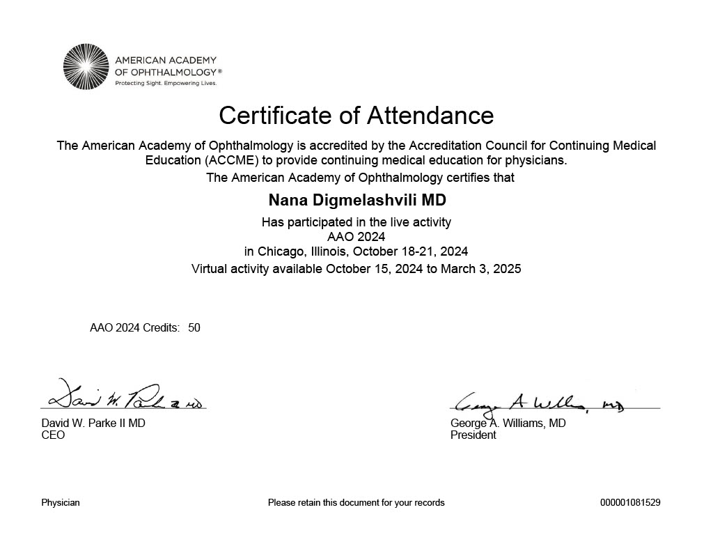 Отдельно необходимо отметить важную роль доктора Наны Дигмелашвили, как ведущего офтальмолога-трансплантолога Глазной клиники МЦ Мардалеишвили. Накопленные и приумноженные знания, умения за годы обучения и совершенствования своих навыков позволяют применять их на практике, в лечении таких сложных заболеваний глаз, как амблиопия, атрофия зрительного нерва, нистагм, дистрофия пигментного эпителия сетчатки стволовыми клетками.