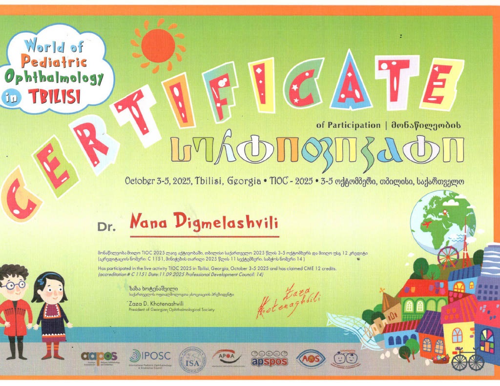 Апрель 2003 – март 2008 – Клиническая ординатура по офтальмологии в Национальном центре неврологии и офтальмологии, Тбилиси