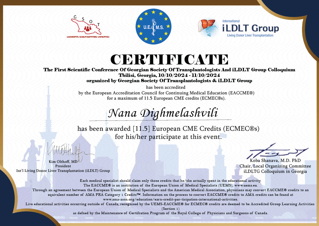 Октябрь 2015 – Первый Тбилисский симпозиум по клеточной терапии, Европейское общество трансплантации органов, Тбилиси